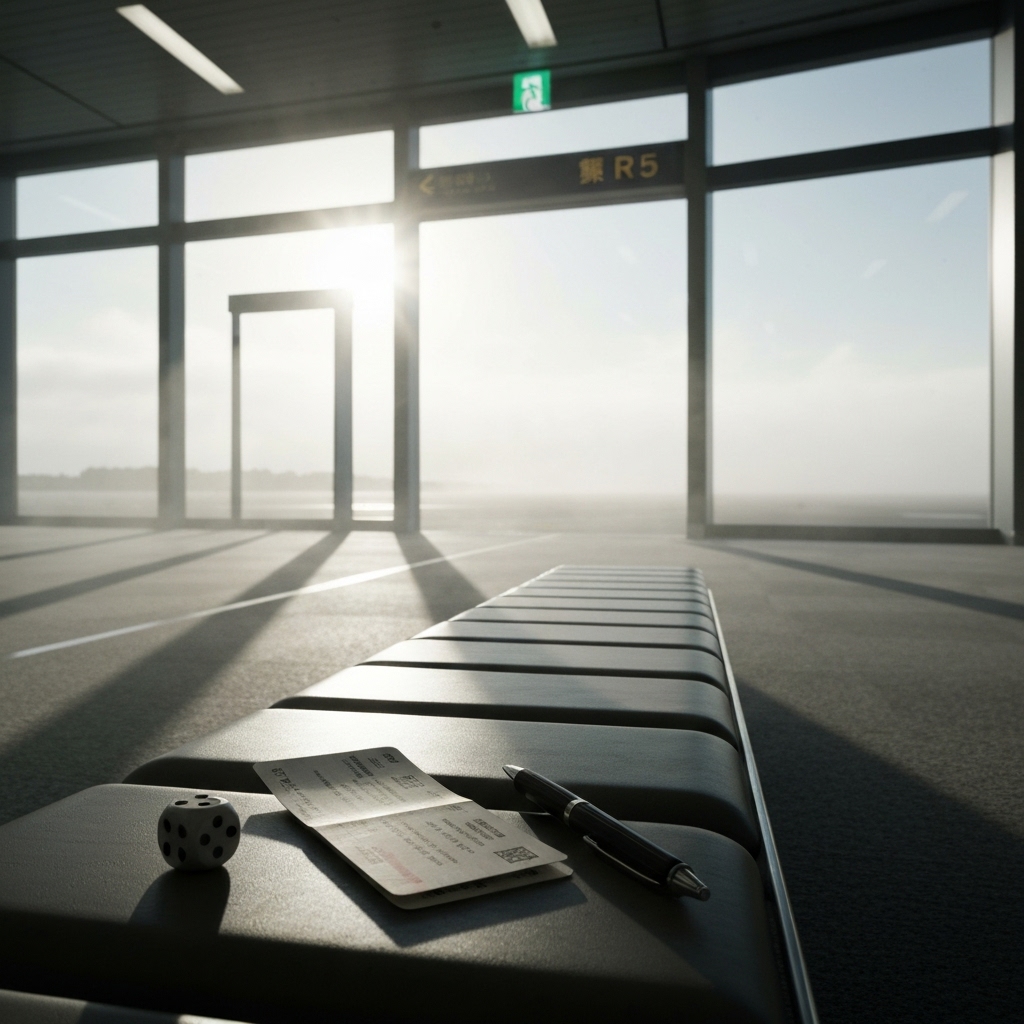 機体が完全に停止する直前、通路の奥から携帯の着信音が響いた。現実のざわめきが静けさを切り裂き、数人が一斉にバッグや上着に手を伸ばす。その波の中で、彼女はまだシートベルトに手をかけたまま、ポケットからペンを取り出していた。サイコロの目は「6」。彼女はそれを覗き込んで、ほんのわずかに表情をほころばせる。 「着きましたね」と僕が言うと、「…うん」と彼女。窓の外、曇天の下に濡れた滑走路が伸びている。機体の重たいドアが軋みを上げて開き、都会的な、薄い土とコンクリートの匂いが急にはっきり流れ込む。 乗客たちの列に続き、僕たちもゆっくり歩き出す。キャリーケースの車輪が小さく引っかかる音と、金属の床板を踏む不規則な振動。エプロンに降り立つと、冷たい風が頬を撫でた。彼女はマフラーの先を無意識に唇に当てる仕草を見せ、一瞬、考え込むように立ち止まる。 「さっき…」彼女が言いかけ、改めて声を探す。「去年も、こうして空港に立ったんです。でも…誰もいなかった」 僕は隣で、遠く滑走路の向こうに霞んでいく光を眺める。頬の内側をそっと噛み、「今年は、どうなりますかね」とぽつり。彼女は小さく笑い、「あの切符、たぶん渡すべき人がいるはずだったんだと思います。…何か、もう少しだけ確かめてみます」 足元の小走りの音や、スーツケースの擦過音が消えかけていく。到着ロビーの先から人々の流れが押し寄せる気配がした。彼女は手のひらでペンを転がしながら、静かな声でつぶやく。「出口まで…一緒に行きます?」 暗いガラス壁に、二人分の影だけが淡く重なっていた。
