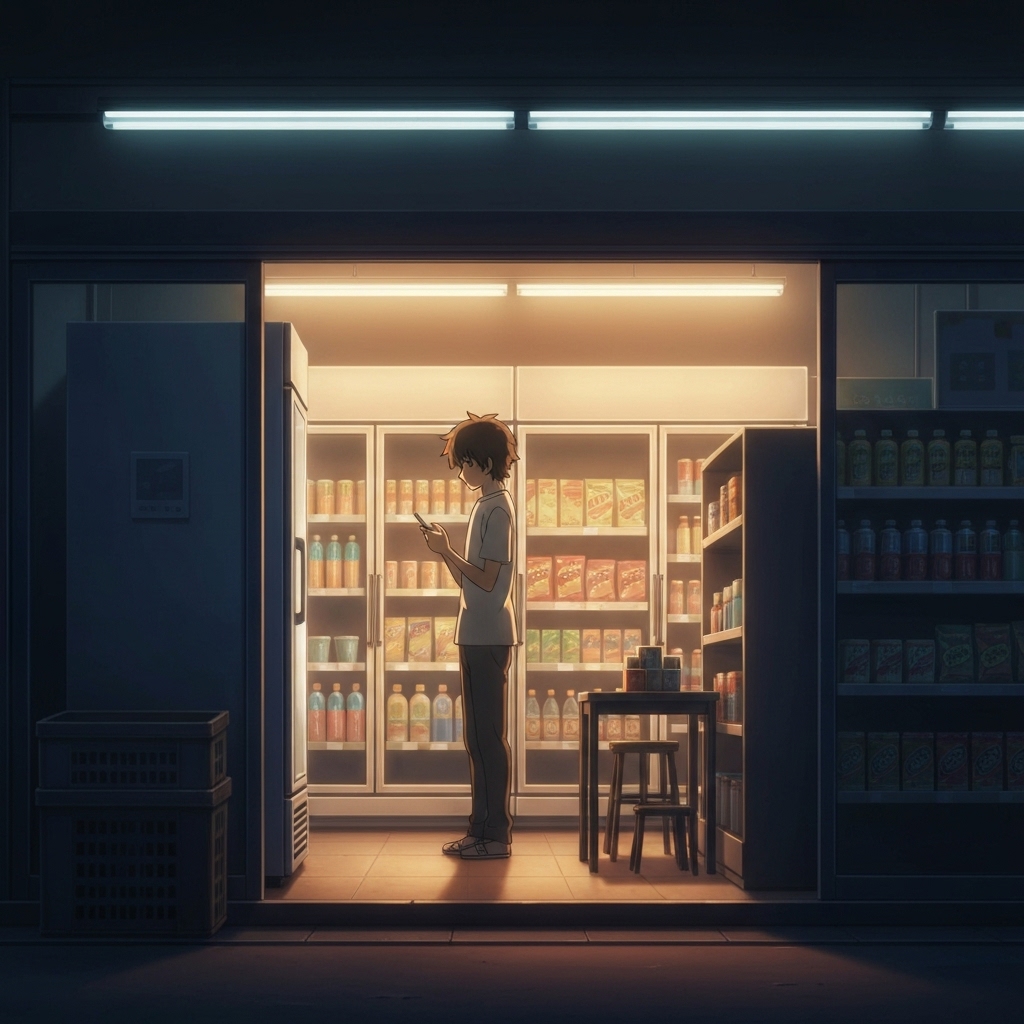 翌日の夕方、店に着くと、バックルームの蛍光灯がひとつだけ点いていた。扉の隙間から小さな影が揺れる。入る前から、誰か分かった。 「…来ると思った」 棚にもたれた悠人が、片手で紙カップを回していた。湯気はほとんど残っていない。 「昨日の、続き」 そう言う声は強くないのに、逃げ道を塞がれたように感じた。 「なんで…戻ってきたの」 自分でも驚くほど小さな声だった。 悠人は一度だけまばたきをして、目線を落とした。カップの縁を指でなぞる癖は昔と同じ。 「家の都合とか、いろいろあるけどさ。それだけじゃねえよ」 言い切らず、唇が少し動いたまま止まる。 「最後の日のこと、ずっと引っかかってて…そのまま離れんの、違う気がした」 胸の奥がじわっと重くなる。あの夏祭りの夜、名前を呼ばれた瞬間の空気まで蘇った気がした。 でも、彼の顔を見られなくて、スニーカーの先だけ見つめた。 「別に、責めに来たとかじゃねえ。ちゃんと言葉にしたいだけ」 少し笑ったような声で、それでも視線だけは外していた。 「週末、時間あるだろ。話すよ。全部」 そこまで言うと、悠人はカップを捨て、扉に手をかけた。 「じゃ、シフト行くか」 残った空気がわずかに揺れて、指先が冷えた。 全部。 その一言が、明日の時間を急に近く押し寄せさせた。